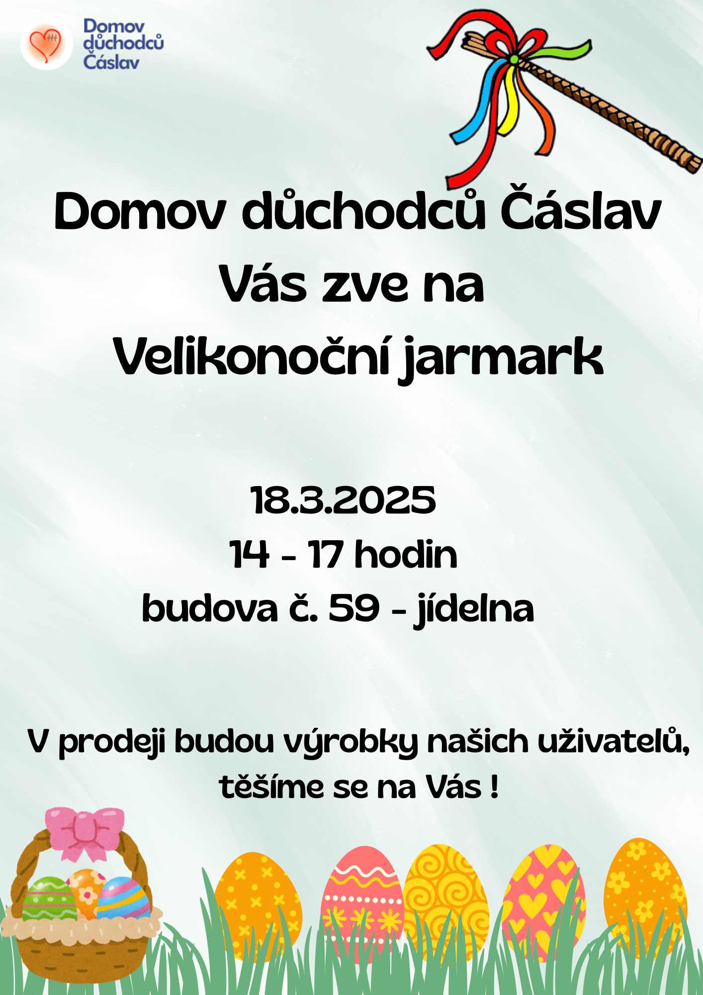 Domov důchodců Čáslav Vás srdečně zve na tradiční Velikonoční jarmark konaný 18.3.2025 v čase 14 – 17 hodin na budově 59 v jídelně. Krásné dekorace formou výrobků za symbolické ceny, které potěší. Neváhejte a přijďte podpořit náš Domov. Těšíme se na Vás.