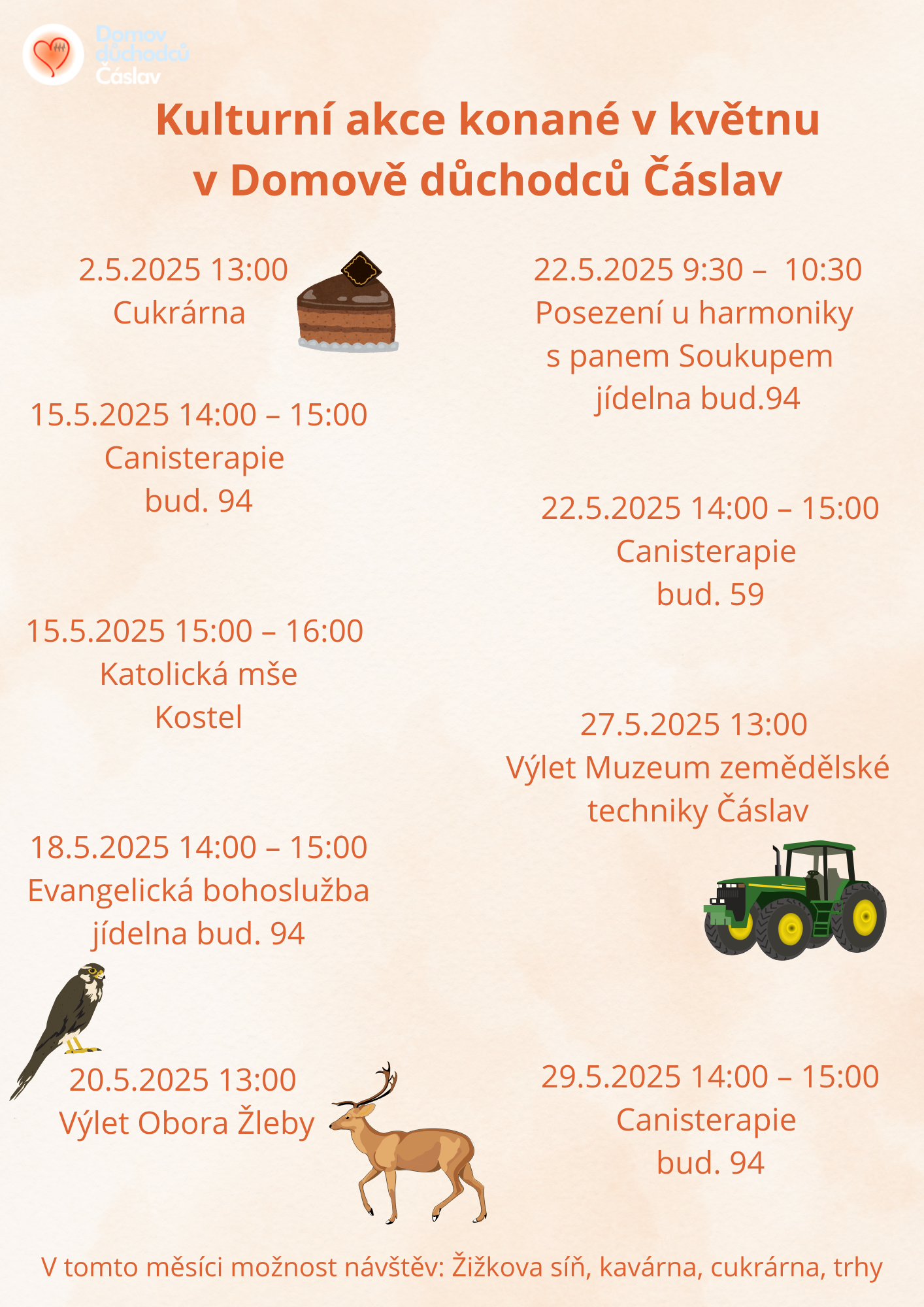 Nahlédněte, jaké kulturní akce se našem v Domově budou konat v květnu. Touto cestou bychom rádi oslovili rodinné příslušníky našich uživatelů. Zveme vás na akce, na kterých můžete strávit čas společně se svými blízkými. Tyto plakáty s akcemi také najdete u hlavních vchodů našich budov. Rovněž jsou vyvěšené po budovách.