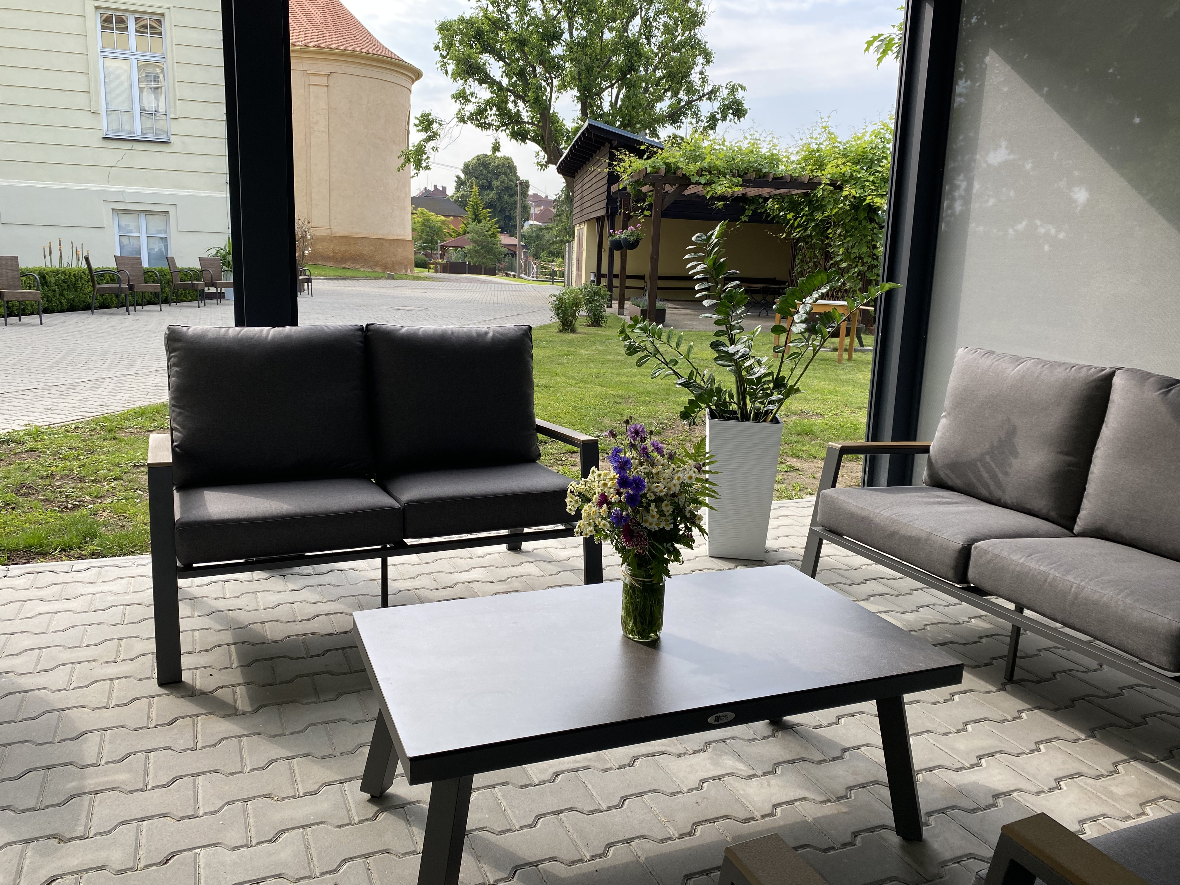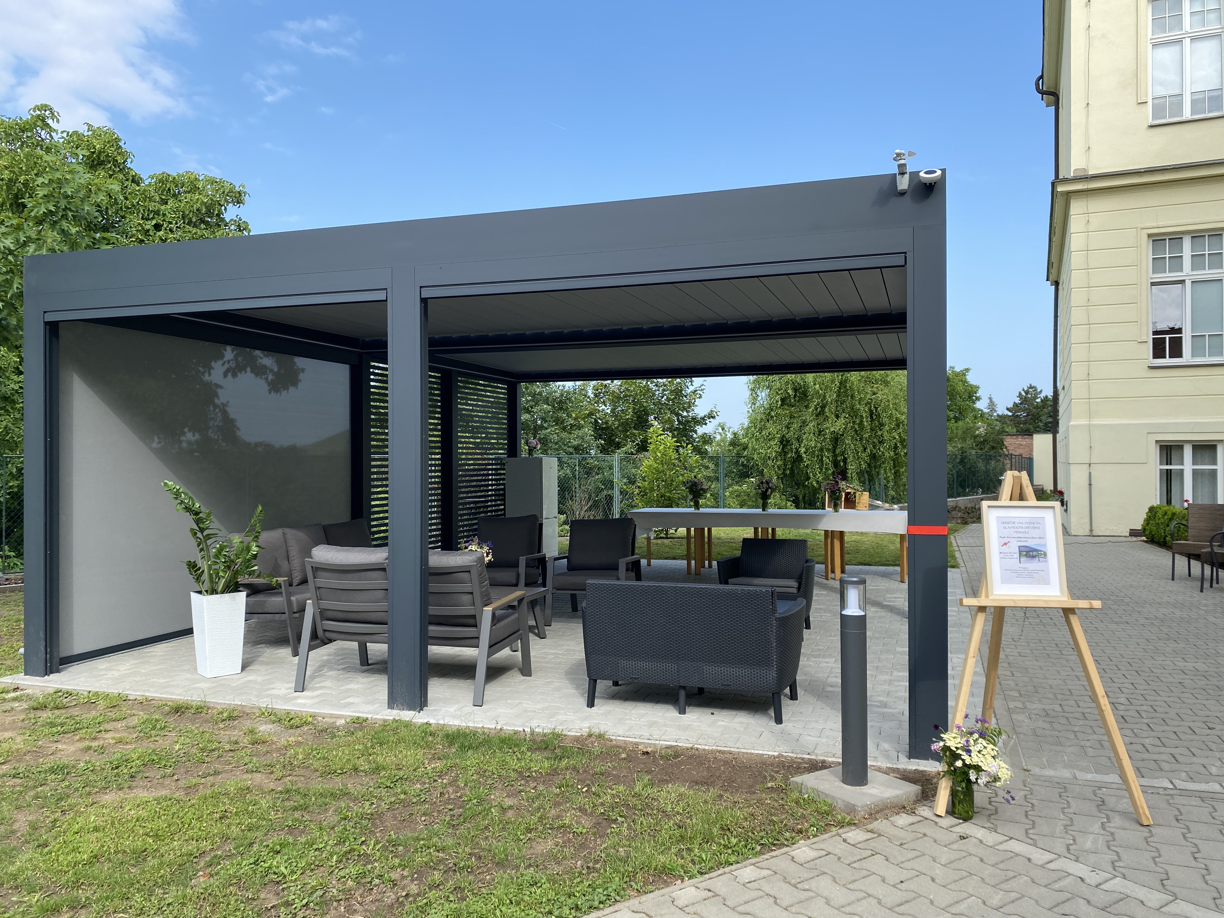 Dne 19.6. 2025 jsme slavnostně otevřeli naši nově postavenou bioklimatickou pergolu. Tato pergola bude sloužit jako posezení pro naše uživatele, i personál.