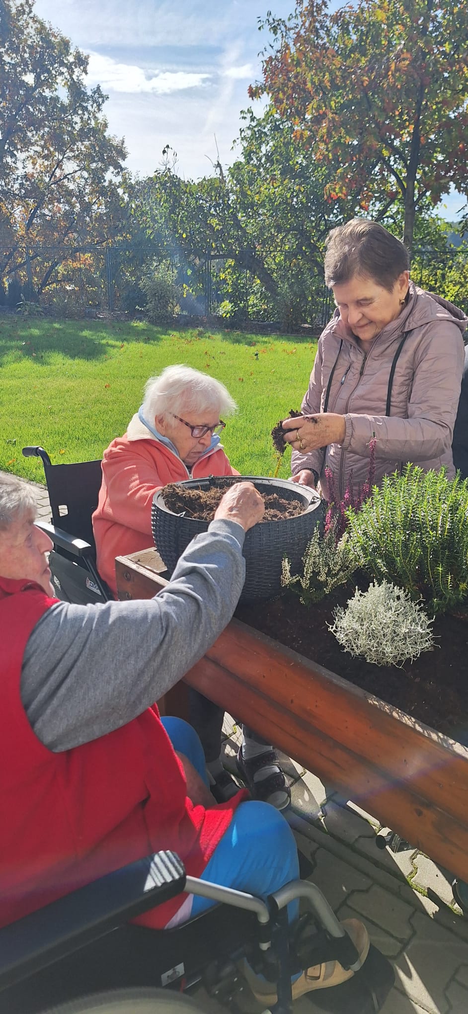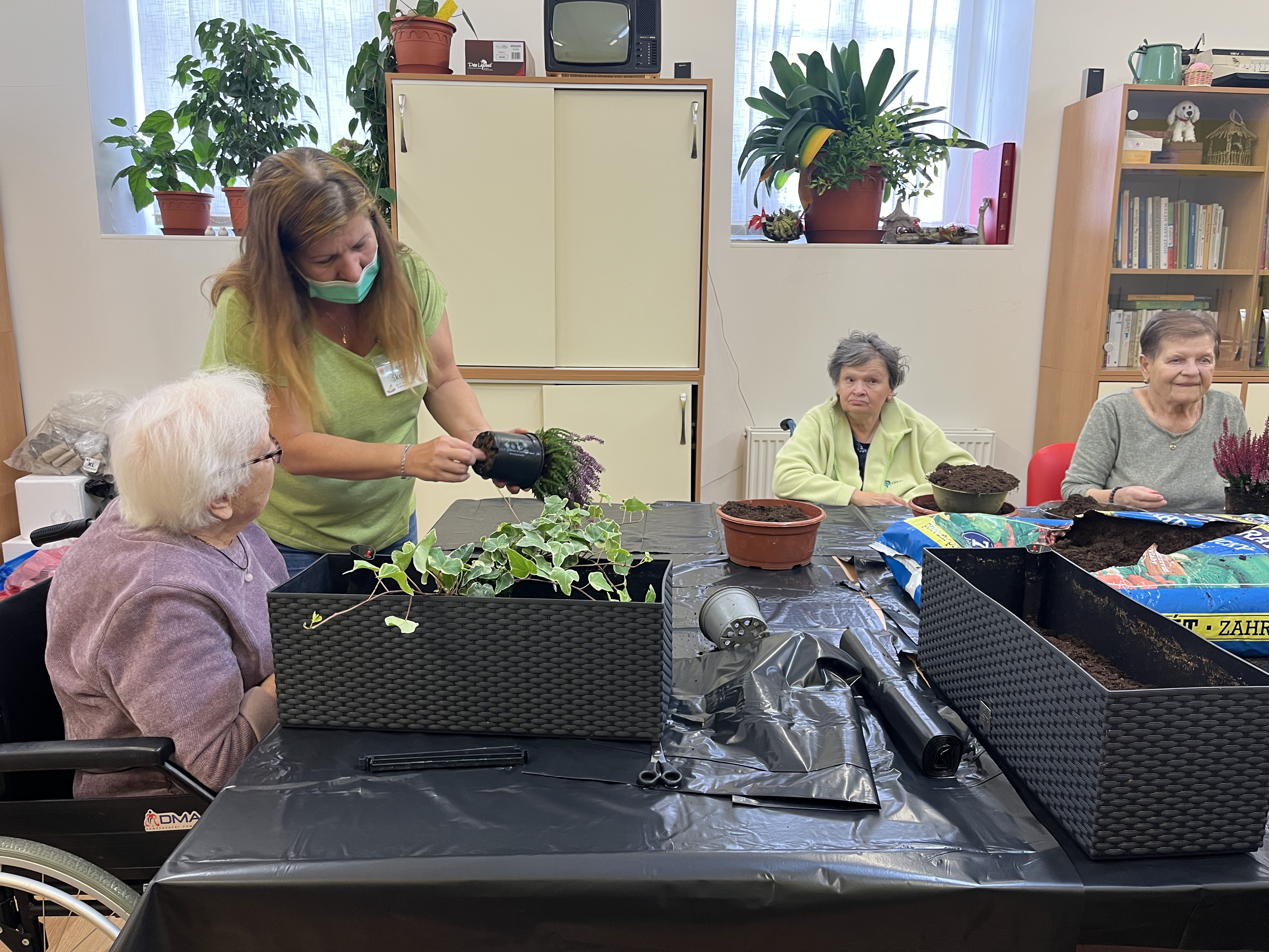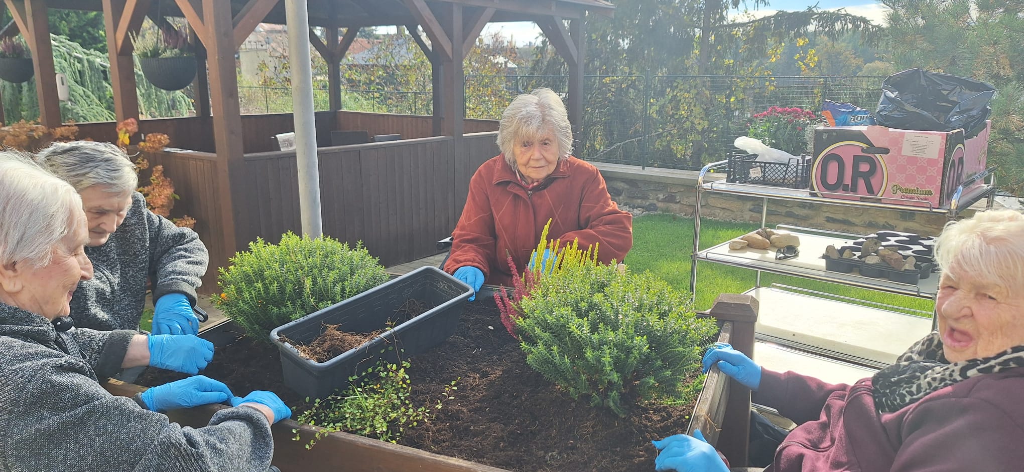 Podzim zaklepal na dveře. Nastal čas rozloučit se s letními květinami a nahradit je podzimními. Naše uživatelky se chopily práce a během několika dní osázely truhlíky, mobilní zahrádky a květináče. S naší dopomocí jim šla práce od ruky. Uživatelky si během sázení popovídaly o podzimních kytičkách, či příchozích dušičkách.